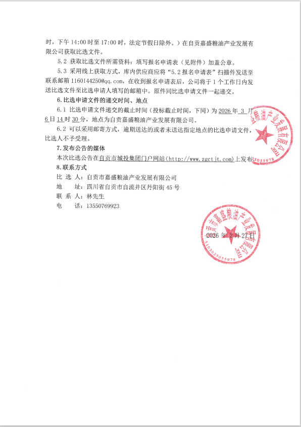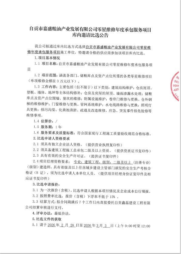 自贡市嘉盛粮油产业发展有限公司零星维修年度承包服务项目库内邀请比选公告