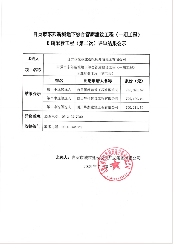 自贡市东部新城地下综合管廊建设工程(一期工程)B线配套工程(第二次)评审结果公示