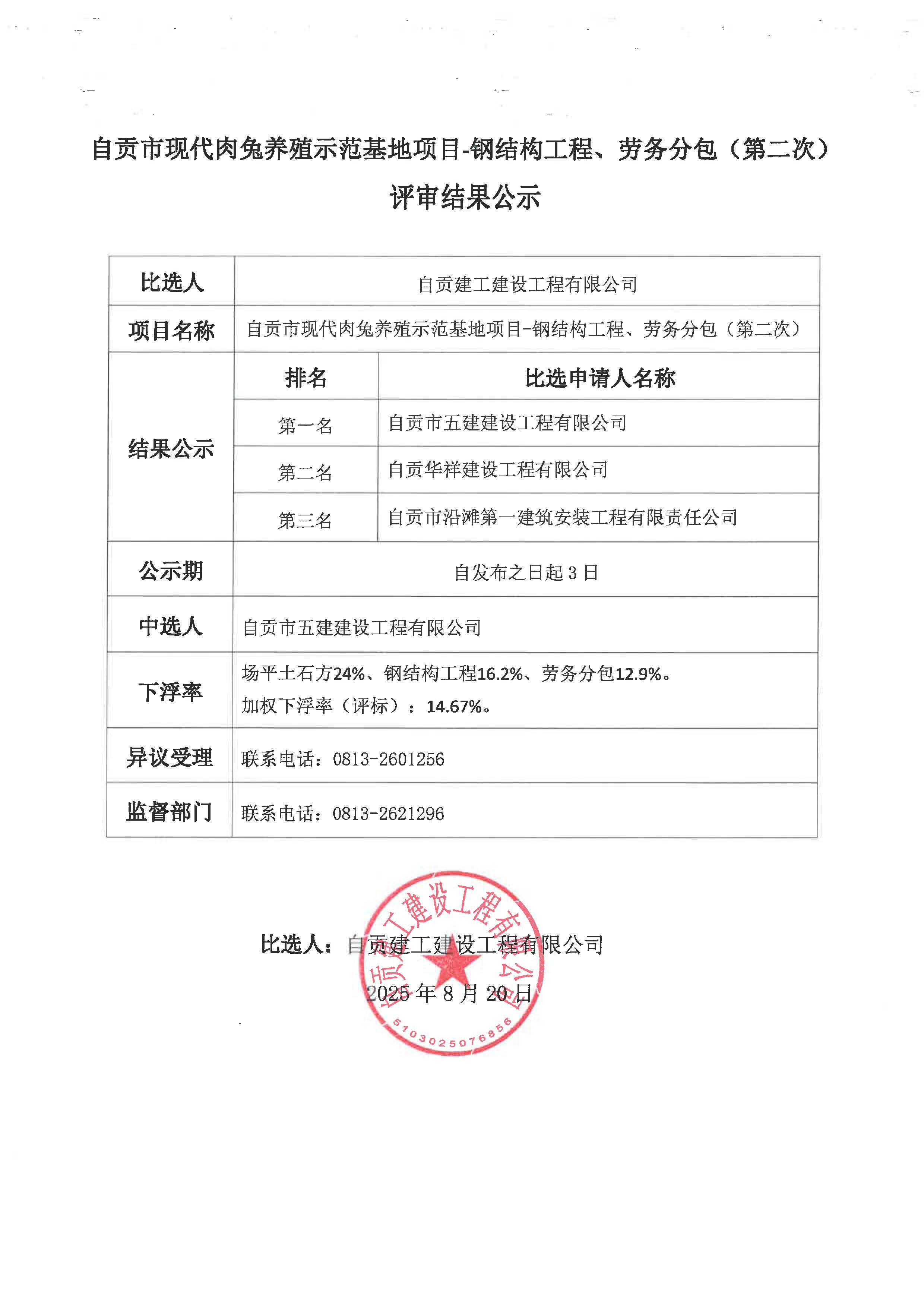 自贡市现代肉兔养殖示范基地项目-钢结构工程、劳务分包(第二次)评审结果公示