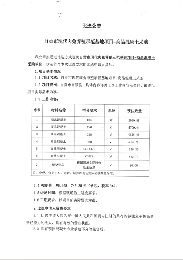 自贡市现代肉兔养殖示范基地项目-商品混凝土采购比选公告