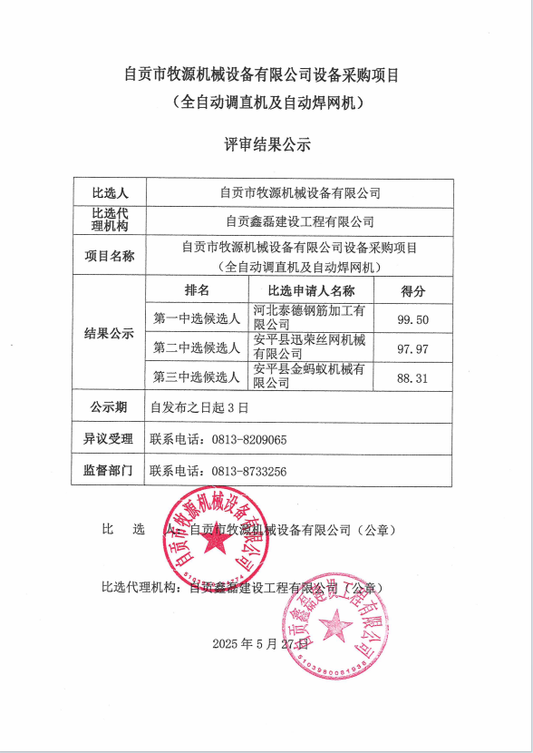 自贡市牧源机械设备有限公司设备采购项目(全自动调直机及自动焊网机)评审结果公示