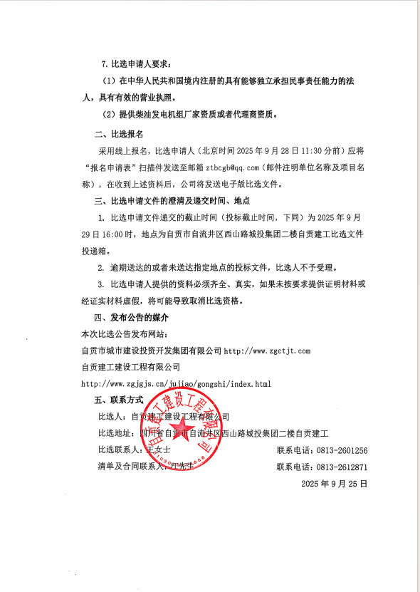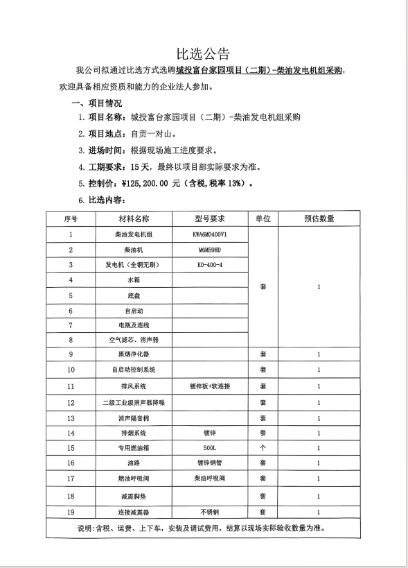 城投富台家园项目(二期)—柴油发电机组采购比选公告