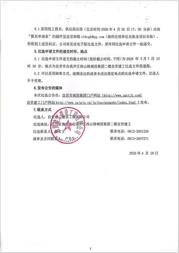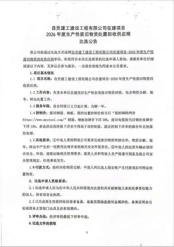 自贡建工建设工程有限公司在建项目2026年度生产性废旧物资处置回收供应商比选公告
