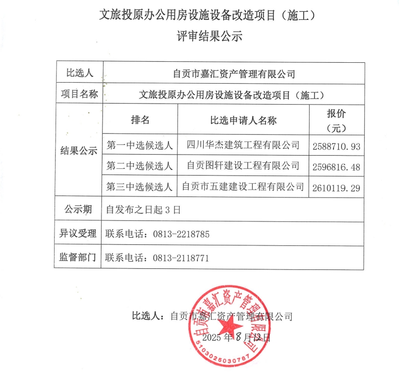 文旅投原办公用房设施设备改造项目(施工)评审结果公示