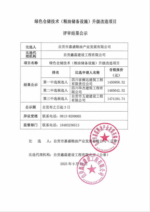 绿色仓储技术(粮油储备设施)升级改造项目评审结果公示