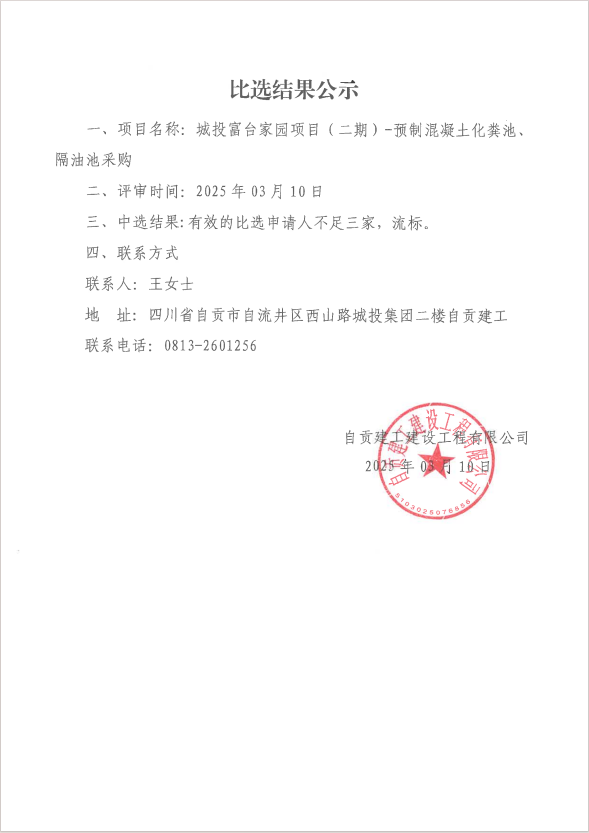城投富台家园项目二期—预制混凝土化粪池、隔油池采购比选结果公示