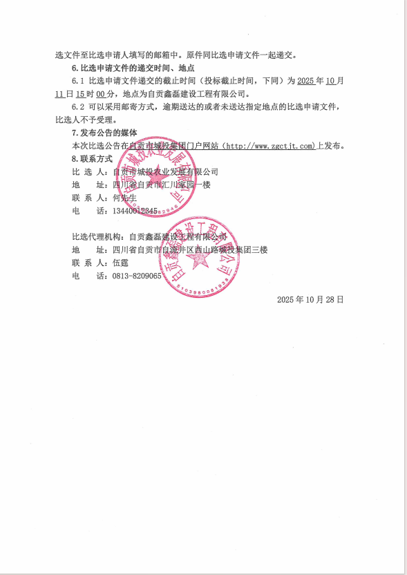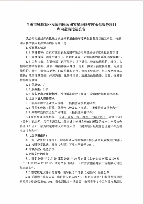 自贡市城投农业发展有限公司零星维修年度承包服务项目库内邀请比选公告
