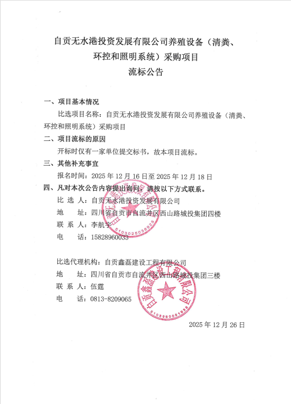 自贡无水港投资发展有限公司养殖设备(清粪、环控和照明系统)采购项目流标公告
