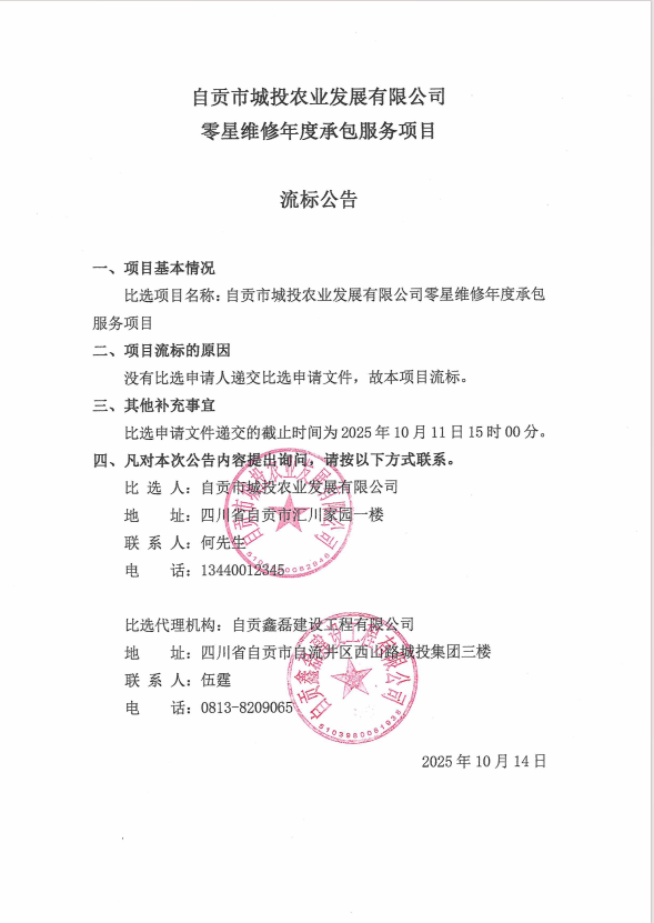 自贡市城投农业发展有限公司零星维修年度承包服务项目流标公告