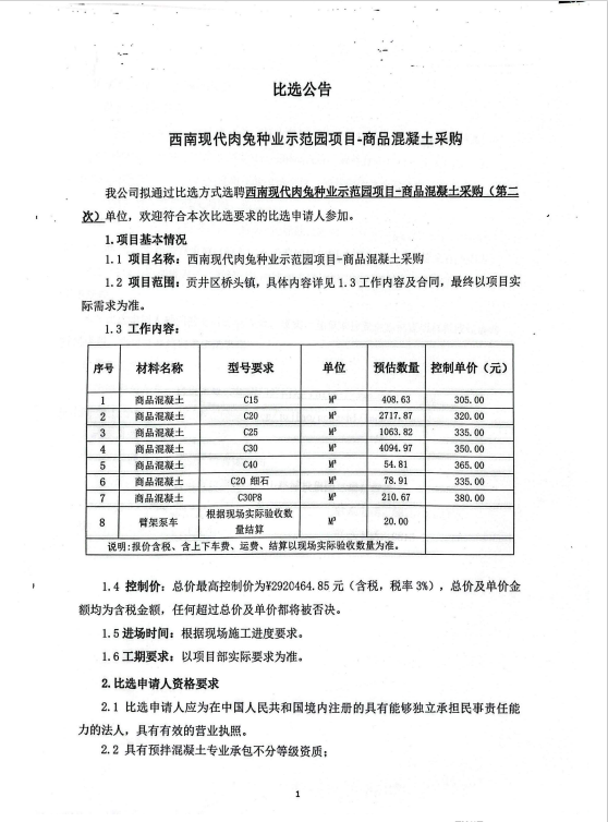 西南现代肉兔种业示范园项目-商品混凝土采购(第二次)比选公告