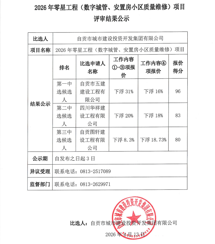 2026年零星工程(数字城管、安置房小区质量维修)项目评审结果公示