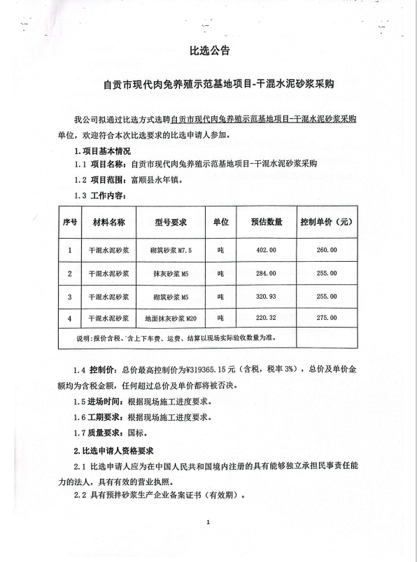 自贡市现代肉兔养殖示范基地项目-干混水泥砂浆采购比选公告