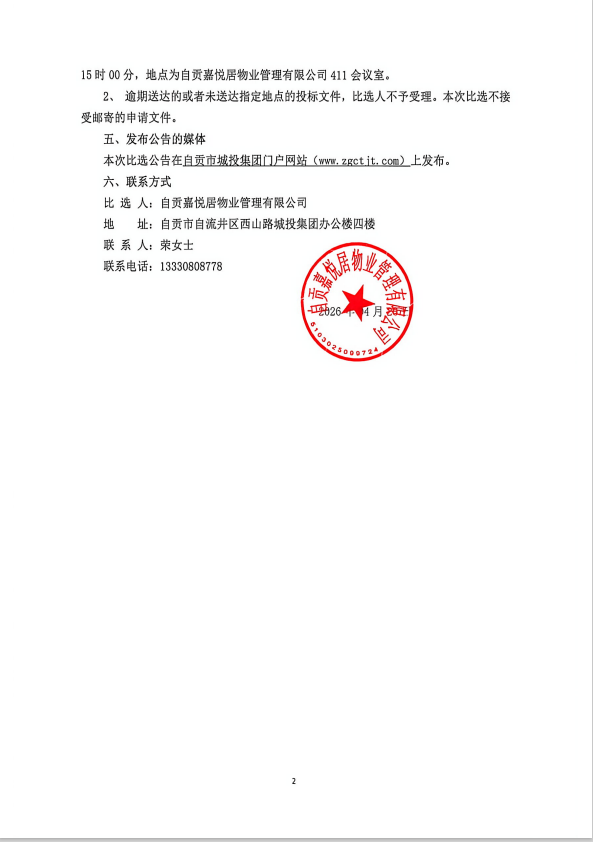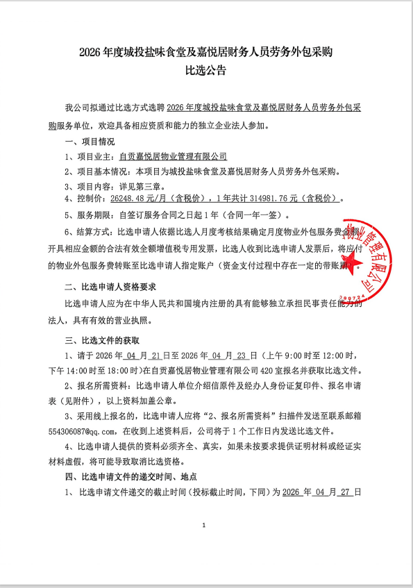 2026年度城投盐味食堂及嘉悦居财务人员劳务外包采购比选公告