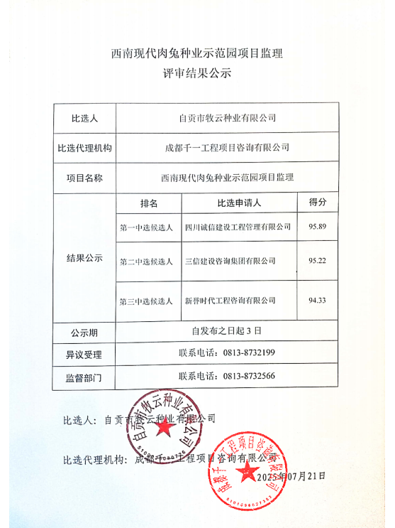 自贡市现代肉兔养殖示范基地项目监理评审结果公示