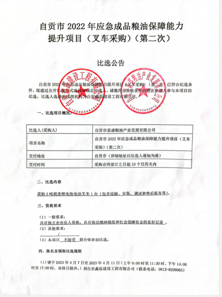 自贡市2022年应急成品粮油保障能力提升项目(叉车采购)(第二次)比选公告