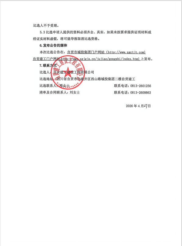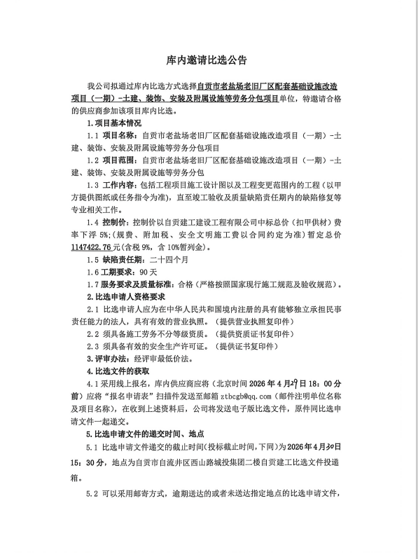 自贡老盐场老旧厂区配套基础设施改造项目(一期)-土建、装饰、安装及附属设施等劳务分包项目库内邀请比选公告
