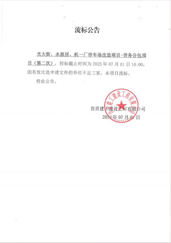 光大街、水涯居、机一厂停车场改造项目劳务分包项目(第二次)流标公告