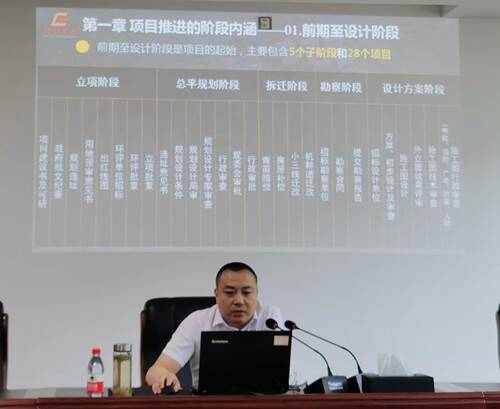 尹治淞从项目推进的阶段内涵、集团现有手续流程框架、自贡市建设工程审批流程、审批所需材料清单等方面为参训人员讲解工程建设基本程序,并以自贡科教新区多功能服务中心项目为实际案例进行讲解。课后,尹治淞还现场人员解答工程建设中的疑难问题。