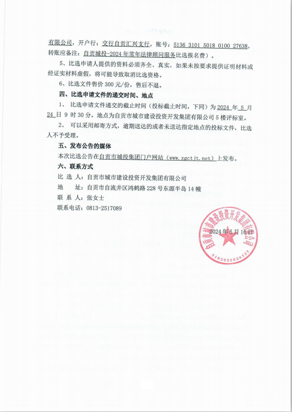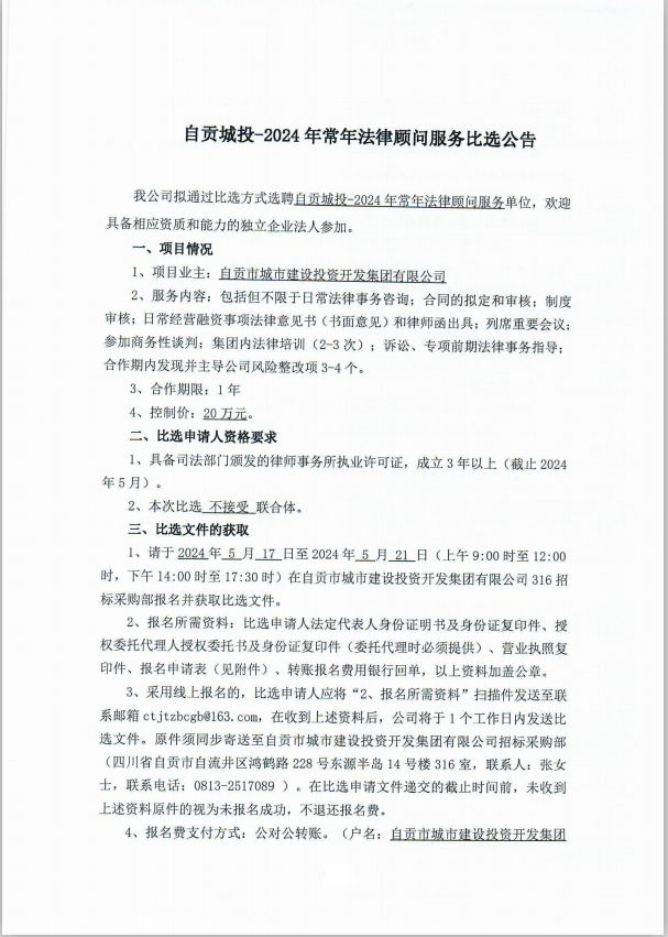自贡城投-2024年常年法律顾问服务终止比选公告