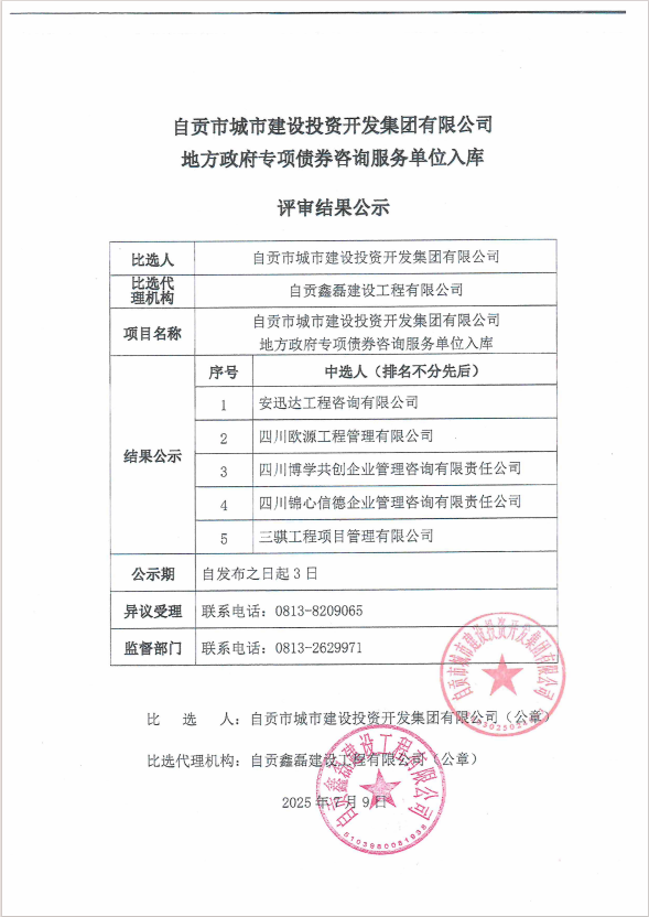 自贡市城市建设投资开发集团有限公司地方政府专项债券咨询服务单位入库评审结果公示