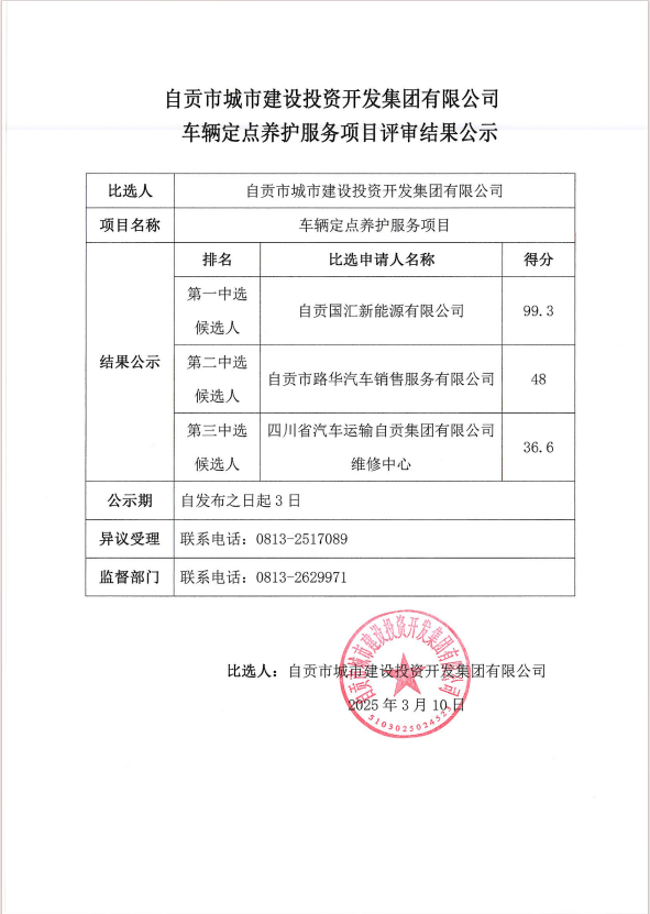 自贡市城市建设投资开发集团有限公司车辆定点养护服务项目评审结果公示